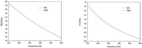 Based on these observations, it seems useful to cross-reference ∆R data with ∆X data. If there is a high ∆R without large variations of X, we are in the presence of edema, whereas if the high ∆R is accompanied by an appreciable ∆X, the problem is, according to the results acquired so far, osteo-cartilaginous. This result, if confirmed by a future more in-depth experimentation, would be relevant. In fact, at present, studies have been conducted either on knees with only inflammatory states characterized by edema [18,19,20], or on knees with only osteoarthritis diagnosis [16,17], but a method based on bioimpedance measurements that allows to distinguish between the two cases in “blind mode” has not yet been proposed. Measurements performed on subject S3, who can be considered the “reference subject”, having never suffered from trauma and having always practiced symmetrical sports activities such as running and swimming, show that in the absence of injuries, the left and the right knees behave essentially in the same way from the point of view of the measured bioimpedance, as it is shown in Figure 10. The situation of subjects NS1 and NS2 seems to be the same. Nevertheless, these results suggest that the ratio between the bioelectrical parameters would be a better indicator than their difference, used as an indicator in previous works in literature. For example, for NS1 the ratio RE(left)/RE(right) is 1.06, while for NS2 it is 0.85, thus indicating that in the first case, there is a deviation of 6%, while in the second of 15%. The same is true for X: for NS1 the ratio X(left)/X(right) is 1.08, while for NS2 it is 0.79, thus indicating that in the first case, there is a deviation of 8%, while in the second of 21%.