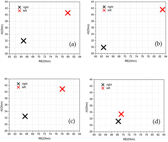 Subject S5 has a particular situation: the data shown in Table 2 refer to the last measurement performed at the end of a control process that lasted months. The subject (44-year-old woman), in fact, suffered from chondropathy patellae of a maximum grade on the left knee joint and underwent surgery more than twenty years ago. When the knee is subjected to intense sporting activity, the resistance and reactance increase compared to the other knee, probably because of mechanisms similar to the ones that will be described for osteoarthritic knees in the next subsection. After all, according to specialists, those who suffer from chondropathy are destined to have arthritis problems [31], so it is possible, given the time elapsed since the surgery, that the subject is in an initial state of arthritis. In correspondence with these events, the subject feels pain and the classic “crunch” of the knee, even in the absence of evident edema. In Figure 11, the evolution of an acute inflammation is shown. Figure 11a shows the reactance and resistance of the (left) suffering knee and of the (right) healthy knee at the beginning of inflammation (identified by the fact that the subject experiences pain). Figure 11b shows the situation after two weeks of sport activity (running and cardiotonic activity). The situation worsened. Figure 11c shows the situation after another 10 days of training, during which the subject tried to load less on the leg in pain. Figure 11d shows the situation after about 3 months of less stressful activity for the joints (walking and swimming) and ice therapy. As it can be observed, although a difference is still present, it is strongly reduced. The situation shown in Figure 11d coincides with the period in which the subject no longer feels pain. The subject then resumed knee joint-heavy activities and a new increase in RE and X was observed (not reported in the figure).