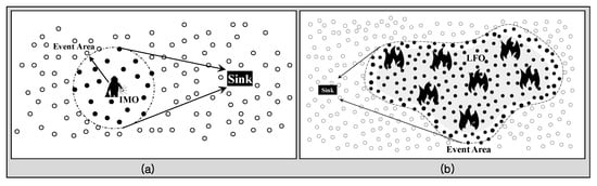 Data dissemination from an event area to a sink: (a) individual mobile objects (IMOs) vs. (b) large-scale fluid objects (LFOs).