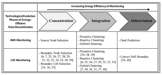Due to energy-constrained sensor nodes, energy efficiency in one of the most important requirements. Studies on energy efficiency typically focus on reducing communication costs since the energy consumption for transmitting and receiving data packets via wireless media is the major factor of battery power consumption of a sensor node [3]. The technological evolution model of IMO monitoring shows key features of all the proposed works in [4,5,12,13,14,15].