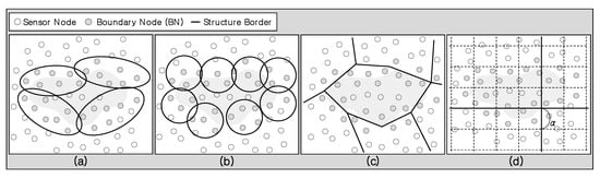 CODA [34] and BFA [37] initially and proactively establish static clusters composed of all sensor nodes on a whole sensor field and each cluster elects a cluster head among sensor nodes located in the cluster. Figure 3c illustrates these proactive clusters. When an LFO appears, the cluster head gathers data from BNs located in the cluster and reports the aggregated data to the sink. Static clustering schemes do not need to reconstruct clusters since clusters are composed of static members not BNs. Although BNs are changed in response of LFO’s alteration, new BNs already know their own clusters and the cluster heads. Static clustering schemes however consume more energy for clusters construction and maintenance than dynamic clustering schemes. Static clustering schemes construct clusters on a whole sensor field whether an LFO appears or not, whereas dynamic clustering schemes construct clusters only near the boundary of the LFO.