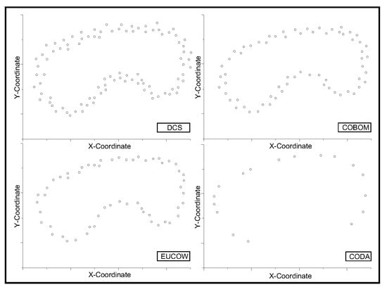 The experiment uses a kidney bean shape of an LFO as a concave one. The LFO is initiated with a width of 20 m and a height of 10 m at center (50, 50). Figure 5 illustrates detection results about the LFO. DCS selects BNs and reactive clusters of BNs are constructed. Integration of DCS is simple aggregation by heads of clusters, so the number of delivered data at a sink is large. In COBOM, one-hop clusters are established and heads of the clusters disseminate only one datum point to a sink. Namely, the number of clusters are larger than DCS, but the number of delivered data is smaller than that. EUCOW has the goal to reduce the number of BNs considering LFO’s diffusion direction. Accordingly, it decides only the approximate shape of the LFO with the smaller number of clusters than COBOM. In CODA, headers of proactive clusters gather location information of all sensor nodes which detect the continuous object; however, CODA is dependent on the convex hull algorithm so that it determines concave shapes into convex ones. Thus, CODA cannot detect reliably the concave objects. On the other hand, TG-COD chooses fine-grained grid cells as the boundary cells over coarse-grained grid cells. The drawing of LFO’s border by the boundary cells follows grid shapes although TG-COD has many advantages against LFO alteration and node density, so here this article does not compare it with others’ detection results via graphs.