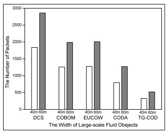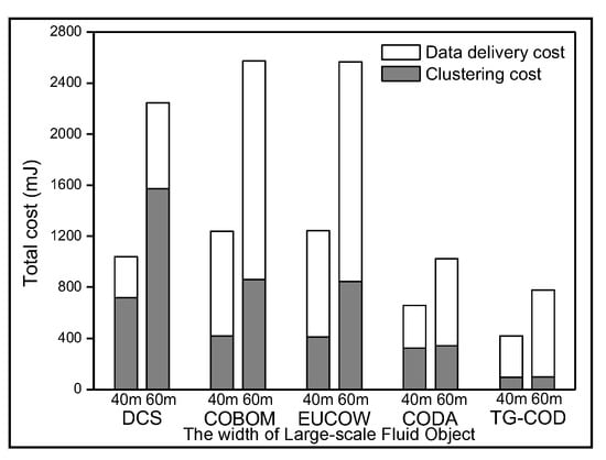 Figure 6 shows the effect of the different size of an LFO in terms of energy consumption. Energy consumption is depending on the clustering cost and the data dissemination cost. Each scheme has two results in cases that the width of the LFO grows from 20 m to 40 m and the width of it enlarges from 20 m to 60 m. DCS, COBOM, and EUCOW consume more energy for clustering than CODA and TG-COD since they reconstruct clusters along with alteration of the LFO. COBOM and EUCOW have lower values than DCS since the one-hop cluster construction cost is relatively smaller than multi-hop clustering. Clustering costs of DCS, COBOM, and EUCOW are also not decoupled from the size of the LFO and spend more energy due to increasing the LFO size. Clustering costs of CODA and TG-COD, however, are not affected by the size. These results are caused since DCS, COBOM, and EUCOW reactively construct structures with BNs whereas CODA and TG-COD proactively construct structures regardless of LFO’s alteration. Dissemination costs of DCS, CODA, and TG-COD have similar results because the effect of integration is similar if their cluster sizes are similar. However, COBOM and DEMOCO consume more energy for dissemination because of smaller cluster sizes. The dissemination cost could not be decoupled from the size of LFO since the amount of reporting data is naturally proportional to the size of the LFO.
