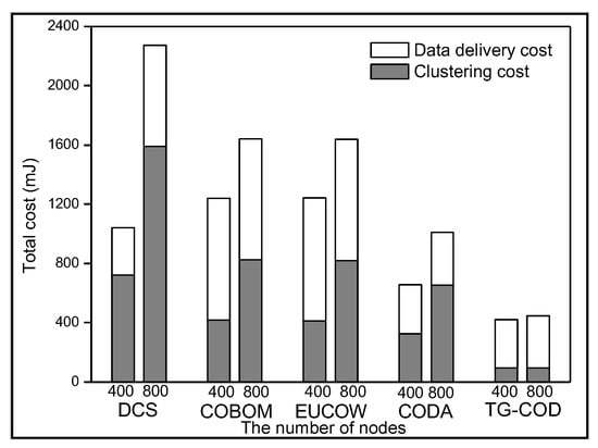 Figure 7 represents the impact of the different node density. Each scheme has two results in cases that the number of sensor nodes is 400 and 800. Clustering costs of DCS, COBOM, and EUCOW are not decoupled from the node density as well as from the size of the LFO since more sensor nodes participate in cluster construction along with increase of the node density. DCS constructs more clusters since it decides the size of a cluster on the basis of the number of BNs. Clustering cost of CODA is also not decoupled from the node density unlike the size of the LFO and consumes more energy. TG-COD is not affected by the node density. This result is caused by that CODA construct clusters through communication between sensor nodes whereas TG-COD constructs virtual clusters which refers to an independent coordinate. Data dissemination cost of DCS is not decoupled from the node density since it constructs more clusters and the effect of integration is reduced. COBOM and EUCOW consumes more energy for data dissemination than CODA and TG-COD due to the restricted clustering but they are decoupled from the node density. Decoupling of COBOM, EUCOW, CODA, and TG-COD in terms of data dissemination cost is caused by that the sizes of their clusters are not changed by the node density.