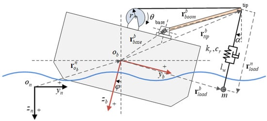 The typical offshore crane has 11-DOF in total [19]. The vessel has 6-DOF and the crane has 5-DOF itself (luff and slew angle of the boom, 2-D swing motion of a payload, and cable length). Considering actual operating conditions, we can reduce the system’s degrees of freedom from 11 to 4-DOF with the following simplifying assumptions