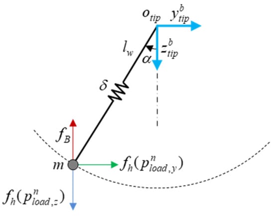 where Equations (7) and (8) are the hydrodynamic forces acting on the submerged payload. is the buoyance force and is the added mass and damping force—expressed in terms of the payload velocity and acceleration. Figure 2 shows the schematic diagram of the payload rotating about the crane tip. The resulting Lagrange equation is given as