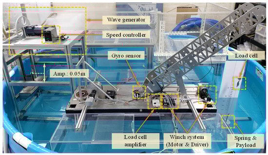 The experimental apparatus used for this study is illustrated in Figure 3. The rope–suspended payload is lifted and lowered using a winch system. The winch system consists of a DC motor, a gearbox, an encoder, and a motor driver. The encoder calculates the rope length and the load cell—suspended by the rope—measures the tension of the rope. On the other hand, a gyro sensor is used to measure the Euler angles. The detailed specifications of the experimental apparatus are listed in Table 1.