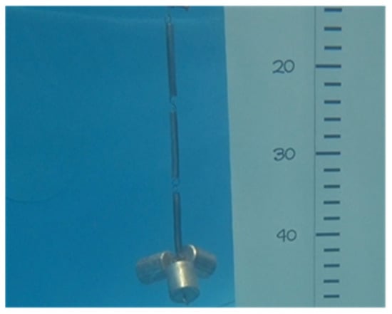 The payload used for the experiment of the nominal system is attached to the end of the rope, as shown in Figure 4. The weight of the added mass is 0.6 kg and that of the spring is at 0.012 kg. The equivalent spring constant is 43.6 N/m. We assume that the mass of the rope is neglected since it is too small. Then, the hydrodynamic coefficients of the payload are identified by analyzing the difference between the dynamic response in the air and water. Thus, we obtain and .