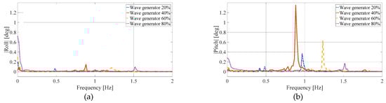 Fast Fourier transform (FFT) results of the pilot vessel’s motion for each wave generator power capacity. The roll angle (a), and the pitch angle (b).
