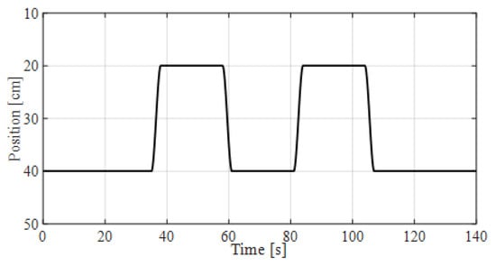 The desired position of the payload is an alternation of a 0.2 m ascent for 3 seconds and a descent of 0.2 m after 20 seconds. In order to generate a sufficiently smooth desired position signal, we use the third-order Hermite interpolation with the MATLAB command ‘pchipinterp’. The generated desired position of the payload is illustrated in Figure 6. However, in practice, when the output power of the wave generator is at 40%, the amplitude of the desired position is set to be 0.1 m due to the basin depth limitations.