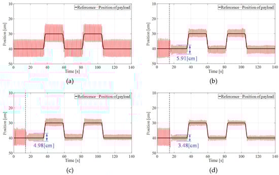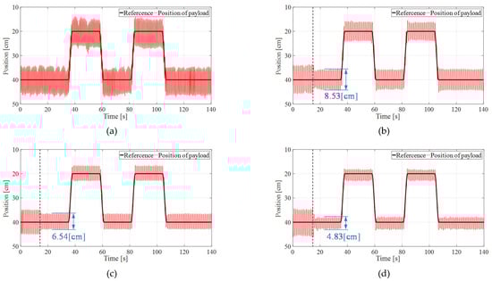 Payload position response from the experiment with the nominal system. The payload position tracking of the desired position without compensation (a), with the IOLC (b), with the ISMC (c), and with the UUB+IOLC (d).