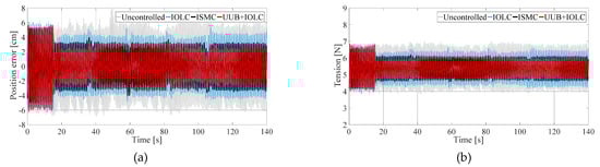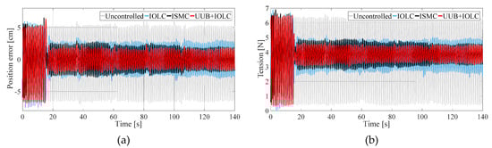 The experiment results with the uncertain system are presented in Figure 10 and Figure 11. Note that only the results when the power output is at 40% with the suction pile are introduced―since it is the worst case. Figure 10 illustrates the payload position response. Figure 11, on the other hand, depicts the position error of the payload as well as the resulting rope tension. Figure 10b shows that the tension variation range when the controller is switched-off is larger than the nominal case. This implies that the impact of the hydrodynamic forces on the 3D printed payload is significantly greater than with the nominal payload. After the controller is switched on, both the ISMC and the UUB+IOLC control system suppress the amplitude of the payload position error as well as the rope tension variations. However, over time, the IOLC control system was not able to attenuate the amplitude of the payload position variations.