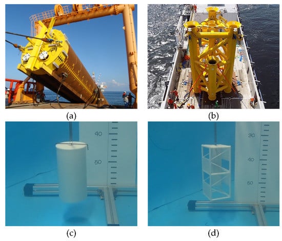 3D printed models for configuration of parametric uncertainty. Examples of the actual subsea installations; a suction pile (a) and a truss structure (b). The 3D printed models of the suction pile (c) and the truss structure (d).