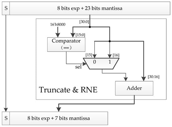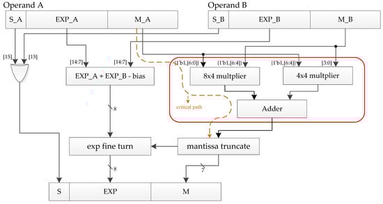 The handling of 23-bit mantissa causes a large area and delay overhead in the FP32 multiplication unit implementation. However, in BF16, the use of a 7-bit mantissa saves a lot of cost in the implementation. In addition, as shown in Figure 8, we reduce the critical path delay and area overhead of the multiplier by removing the LSB 4-bit by 4-bit multiplication operation from the 8-bit by 8-bit mantissa multiplication.