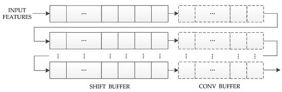 If all convolution matrices are calculated in parallel, too many computing resources will be consumed. Therefore, we propose a serial-to-matrix conversion unit based on the shift register to reuse the input feature maps and generate the convolution matrices in the form of pipelines, which can significantly reduce the requirements of computing resources and keep the convolution operation unit busy. As shown in Figure 6, this unit consists of CONV_BUFFER and SHIFT_BUFFER. The sizes of CONV_BUFFER and SHIFT_BUFFER are and , respectively. Specially, the input bandwidth of this unit is very low, that is, the bit-width of the input data. The following five steps are executed in parallel in each clock cycle: