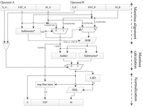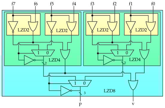 As shown in Figure 9, the BF16 addition unit proposed in this paper is mainly composed of the following three parts: mantissa alignment, mantissa calculation, and normalization. The mantissa is self-aligned by comparing the 8-bit exponents of the two operands. The mantissa calculation method, that is, addition or subtraction, is determined according to the result calculated by XORing, the sign bits of the two operands. If the XORing result is 0, it means that operands A and B have the same signs, and two mantissas are added, otherwise two mantissas are subtracted. In particular, because the exponent and mantissa (with a hidden bit) of BF16 are both 8 bits, we use time-division multiplexing for Subtractor* to save cost in the implementation. The Leading Zeros Detector (LZD) is the most important part of the normalization. The function of the LZD is very simple. It counts the number of zeros that appear before the first “1” of the mantissa result sequence. However, it is a very complicated process to design the LZD directly according to the function description, because every bit of the output depends on all the input bits. Such a large fan-in will cause a high delay. Therefore, we propose a hierarchical 8-bit LZD (LZD8) to solve this problem, as shown in Figure 10. Its truth table is shown in Table 2.