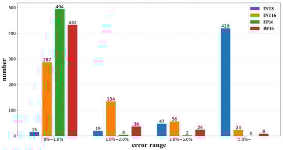 Using our experiment methodology, the error comparison was measured. Firstly, we generated a random feature test set with a uniform distribution between 0 and 255 to describe the input of the image. Then, we scaled the feature test set from [0, 255] to [0, 1]. In addition, we generated a random weight test set with a Gaussian distribution (mean: 0, standard deviation: 0.1), referring to the weight distribution in MobileNet-V3 [27]. Secondly, we randomly selected 500 sets of original data from the above two data sets, where each set of original data contained nine features and nine weights. Then, we used the original data (FP32) as the inputs of the convolution operation unit, and the FP32 output of the unit was used as the baseline. Finally, we quantized the original data from FP32 to INT8, INT16, FP16, and BF16, and used the quantized results as the inputs of the convolution operation unit. The outputs were compared to the baseline for error, which can be calculated by Equation (8):