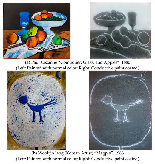 Museums are evolving to provide enjoyable experiences for everyone, moving beyond audio guides to tactile exhibitions [4,5]. A previous study [6,7] reviewed the extent and nature of participatory research and accessibility in the context of assistive technologies developed for use in museums by people with sensory impairments or learning disabilities. Some museums have successfully produced art replicas that can be tactilely experienced. For example, the Metropolitan Museum of Art in New York has displayed replicas of the artworks exhibited in the museum [8,9]. The American Foundation for the Blind offered guidelines and resources for the use of tactile graphics for the specific case of artworks [10]. The Art Institute of Chicago also uses 3D-printed copies of its collection to support its curriculum for design students. Converting artworks into 2.5D or 3D allows the visually impaired to enjoy them using touch, with audio descriptions and sound effects provided to enhance the experience. In 2.5D printing, a relief model, a tactile diagram of a computer-edited drawing, is printed onto microcapsule paper called swell paper that enables the visually impaired to easily distinguish the texture and thickness of lines [10]. Bas-relief tactile painting is a sculptural technique that produces specific shapes that protrude on a plane [10]. The quality of the relief is measured using the perceived quality of the represented 3D shape. Three-dimensional (3D)-printed artworks are effective learning tools to allow people to experience objects from various perspectives, improving the accessibility of art appreciation and visual descriptive skills of the visually impaired by providing an interactive learning environment [11]. Such 3D printing technology improves access to art by allowing the visually impaired to touch and imagine an artwork. For example, the Belvedere Museum in Vienna used 3D printing technology to create a 3D version of Gustav Klimt’s “The Kiss” [12] and the Andy Warhol Museum [13] released a comprehensive audio guide that allows visitors to touch 3D replicas of artwork during an audio tour.