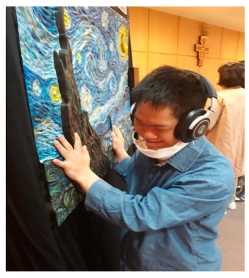 BlindTouch works were exhibited for three weeks at St. Mary’s School (a special school for the visually impaired operated by a 65-year-old Catholic institution located in Cheongju, Korea) for three weeks from October 12 to 30, 2020 [36]. A student, Geon Tak (Figure 2), who especially liked “The Starry Night”, looks very satisfied.