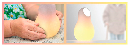 Empathy is a communication skill by which one person can share another person’s personal perceptions and experiences. A similar concept is rapport, which refers to understanding other people’s feelings and situations and forming a consensus (or trust) with them. Empathy is an essential virtue in segmented modern society. Ambi, Figure 3, created by Daniel Cho, RISD, Province, RI, USA, 2015, is a nonverbal (visual, tactile, or sound) telepresence and communication tool used for promoting empathy and rapport between family members and couples. Sensors recognize intuitive and non-verbal (visual, tactile, or sound) signals and exchange empathetic emotions. Ambi’s proximity sensor recognizes a person’s presence and emotional state and communicates it to another person. One way to express affection is to wrap your hand around the Ambi’s waist. In addition, through the non-visual sense of touch or sound, the visually impaired can share empathetic emotions with the others. The constant and immediate tactile feedback of another’s presence and nudges allows the visually impaired to have more intimate connection and non-verbal communication with others that the video chat applications alone cannot provide.