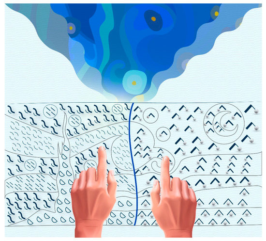 As shown in Figure 4, the graphic of colors floating into the colorless paper with two kinds of tactile color pictograms [86] represents the fact that although the artwork with the patterns looks “colorless” to a visually unimpaired person, a person with visual imparity can experience the full range and diversity of colors in the artworks.