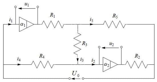 Consider an electrical circuit that consists of five resistors and two RC ladder elements of different fractional orders described in the previous section and denoted by triangles in the diagram shown Figure 2. The input voltage is a step signal with magnitude . The initial voltages across the capacitors are assumed to be zero, i.e.,  and .