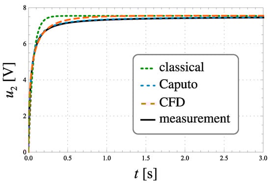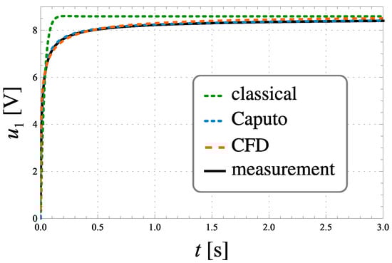 For the circuit under consideration, we know the general form of the solution of state equation (31) and we take into account steady-state voltage vector (39) as well as matrices  and  in (38). We may also assign an appropriate function  for the Caputo definition case (33), for CFD derivative (36) and for the classical first-order derivative case (37).