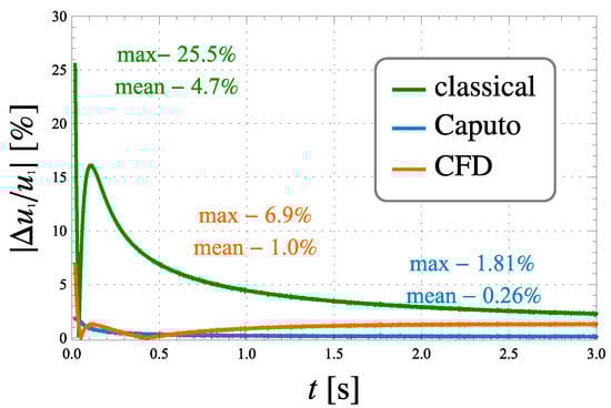 The model with the CFD derivative allows for greater precision of description, especially in the initial stage of loading. The maximum relative error is over three times smaller than in the classical case model and is no more than 8.5%. The time interval in which the response of the CFD model significantly differs from the experimental data is shorter than in the classical case model, which is reflected in the mean values of the relative errors.