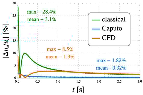 Analysis of the characteristics shown in Figure 3, Figure 4, Figure 5 and Figure 6 implies that the model with classic integer-order derivative is highly inaccurate. This model is not able to reflect the dynamic behaviour of the process, especially the initial stage of charging, when the voltage changes across the fractional order ladder element are very rapid. The relative error of the time-voltage characteristics of the ladder systems reach a value exceeding 28.5%.