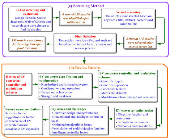Content analysis was chosen to conduct this survey. The appropriate article selection of this review was carried out through three screening phases. The first screening was the literature survey which was performed using the Google Scholar, Scopus science database, Web of Science and Research Gate platforms. A total of 638 articles were explored after the first screening. Next, the second screening was carried out using important keywords, including DC-DC converter, electric vehicle, intelligent controller, modulation techniques, metaheuristic optimization, battery storage systems. Apart from keywords, the paper title, abstract and article contents were viewed to find the relevant articles. The authors identified a total of 372 articles after the second screening. Afterward, the third screening and assessment were conducted based on the number of citations, review process and impact factor and, accordingly, a total of 180 articles published in recent conference proceedings, books, recognized webpages and notable journals were identified. The authors read the selected 180 articles thoroughly to extract useful information as well as carry out critical review, analysis and discussion relating to EV converters, controllers, modulation, optimization, issues and challenges. The schematic diagram of the reviewing methodology is shown in Figure 1.