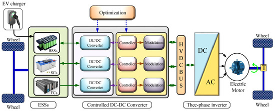 The architecture of an EV drivetrain includes ESSs, converters, controllers, modulation, optimization and an electric motor. ESSs, including a battery, supercapacitors (SCs) and fuel cells (FCs), are connected to a DC-DC converter through a suitable controller and modulation scheme. The connection from the DC-DC converter to the electric motor is established through a high-voltage (HV) DC bus follows by a DC-AC inverter, as presented in Figure 2.