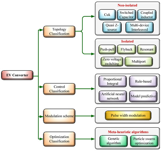 The complete classification of EV converters, including topology, control, modulation and optimization, is presented in Figure 3. The configuration of converters in EVs can be categorized into two groups: non-isolated and isolated. The non-isolated converter is appropriate for EVs under medium- and high-power operation [86,87], while isolated DC-DC converters are suitable in EVs with low- and medium-power purposes [88,89].