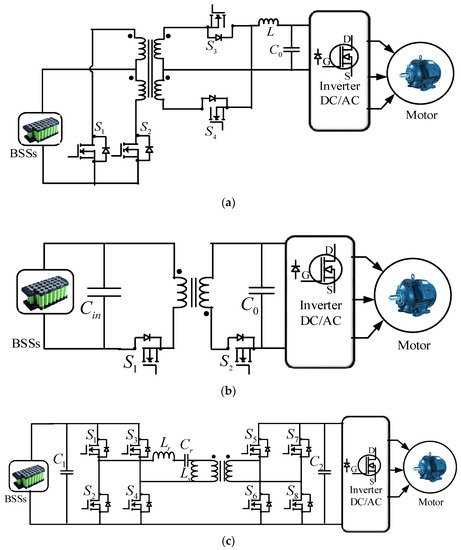To connect the ESS with the HV DC link of the drivetrain, each DC-DC converter needs definite requirements and specifications. Firstly, bidirectional DC-DC converters support regenerative braking and improve efficiency [54,55,56]. Secondly, a DC-DC converter with appropriate control and modulation is necessary to carry out fast charging and discharging operations in SCs as well as to avoid incompatible operations [57,58,59]. Thirdly, the topology of a DC-DC converter with few passive components is preferred for SCs to minimize the transition duration between the charging and discharging phases [60,61,62]. On the contrary, fast dynamic control is not required in the case of BSSs due to long interval charging profiles [63]; however, the lower input current ripples are suitable to extend the lifespan of BSSs [64,65]. Fourthly, a DC-DC converter in EVs exhibits a high voltage gain and high power output [66,67,68]. Fifthly, BSSs and SCs obtain low output voltage; hence, an HV DC-DC converter is needed to achieve a high voltage level by storing the energy either in capacitors or inductors using diodes, insulated gate bipolar transistors (IGBTs) and metal–oxide–semiconductor field-effect transistors (MOSFETs) [28,69,70,71]. An ideal DC-DC converter offers several benefits, including low price, light weight, compact size, efficiency, scalability and controllability, which are highly desirable in the EV automotive industry [72,73,74]. Regardless of having many benefits, an HV DC-DC has several shortcomings, such as low efficiency because of hard-switching, very flat voltage gain, incapability to achieve high power density and difficulties to construct a high bandwidth control loop [75,76,77,78,79].