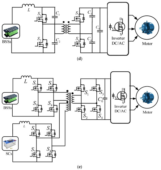 Configuration of a non-isolated DC-DC converter for EVs: (a) Cuk converter, (b) switched-capacitor bidirectional converter, (c) couple inductor bidirectional converter, (d) quasi-Z-source converter and (e) multi-device interleaved bidirectional converter.
