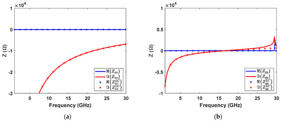 Surface impedance of the periodic surface comprising dipole resonator along (a) x–direction and (b) y–direction. The simulated periodicity is equal to 10 mm. The lumped parameters of the circuit models have the following values: Cx = 19.2 fF, Cy = 0.7 fF, Ly = 2.4 nH.