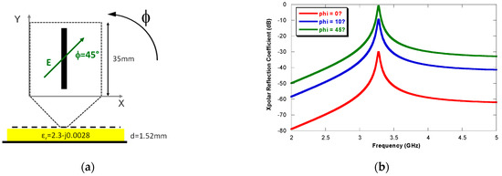 The dipole is an optimal linear polarization converter when the azimuthal angle of the impinging wave is 45°. This behavior of the dipole is shown in Figure 5b, in which the amplitude of the cross polar reflection coefficient simulated for three different azimuthal angles: ϕ = 0°, ϕ = 10°, ϕ = 45° is shown. The unit cell and the simulated stack-up is shown in Figure 5a. As evident from Figure 5b the optimum angle is ϕ = 45°. In fact, in this case, the dipole exhibits the maximum level of the cross polar reflection coefficient (0 dB). When the electric fields impinge with an azimuthal angle ϕ that is different from 45°, the AIS is not able to convert the polarization of the EM wave.