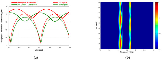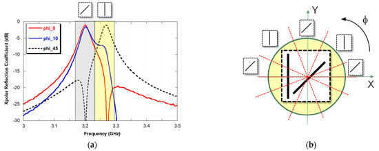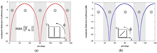 The angle ϕ = 45° is the only case in which the polarization conversion conditions are met. The selectivity of the peak can be increased by reducing the thickness of the substrate, but this may lead to a lower polarization conversion at the resonance frequency because of enhanced absorption loss of the substrate. In order to evaluate the behavior of the dipole with respect to the variation of the azimuth angle it is possible perform the simulation of the FSS for different values of ϕ ranging from 0° to 360°, thus obtaining numerous curves like the one reported in Figure 5b. Subsequently, it is possible to plot all the maximum values collected from each curve as a function of the ϕ angle thus obtaining the graph reported in Figure 6a. It is evident that there are some angular sectors in which the dipoles do not polarize the EM wave. In these angular sectors, that are indicated with the grey color in Figure 6a, the amplitude of the cross polar reflection coefficient is below −5 dB. It is interesting to observe the behavior of the dipole when it is tilted by 45° over the ϕ direction. In this case, the angular sector in which the performance of the polarizer are not acceptable are shifted of 45° over the ϕ direction with respect to the vertical dipole. In light of these results, in order to obtain a polarization converter which is robust to the rotation over the angle ϕ, it is natural to put together the two dipoles in the same unit cell.