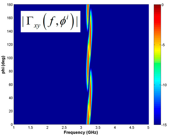 The robustness of the combined unit cell is it evident in the bidimensional false color map in which the amplitude of the cross polar reflection coefficient as a function of the frequency and rotation angle ϕ is shown in Figure 9.
