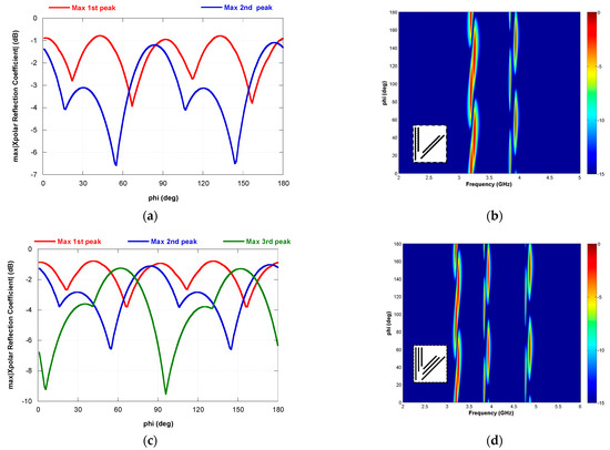 The map has been obtained by extracting the behavior of the reflection coefficient of the AIS surface for all azimuth angles with the analytical post-processing procedure described in the Appendix A. The procedure allows to extract the azimuth angle behaviour of the unit cell from a single full wave simulation with a fixed azimuth angle. From the graph it is evident the alternation in the operation of the two dipoles. On the basis of the unit cell topology shown in Figure 7a it is possible to obtain a multiband polarization converter by adding pairs of dipoles in the unit cell. The maximum of the amplitude of the cross polar reflection coefficient as a function of the azimuthal angle for the dual-band and tri-band polarization converter are respectively shown in Figure 10a,c. In Figure 10b,d the bidimensional false color map of the amplitude of the cross polar reflection coefficient as a function of the frequency and rotation angle ϕ for the dual-band and tri-band polarization converter is reported.
