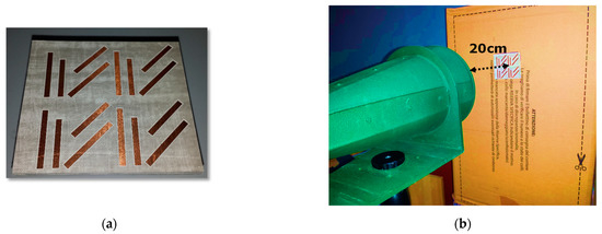 The fabricated prototype is shown in Figure 11a. The measurements have been performed with a dual-polarized horn (Flann DP240) placed in front of the tag at a distance R = 25 cm as shown in Figure 11b. A prototype without the 45° tilted dipoles has been fabricated and compared to the polarization converter based on the combined cell.