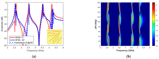 (a) Representation of the incident field and the scattered field on a generic unit cell shape. (b) Frequency behavior of a four dipoles unit cell shown in the inset over a 1.52 mm thick grounded Teflon substrate. The frequency behavior simulated at ϕ i = 0° and ϕ i = 45° is compared with the result obtained according to relation (A3) by using the data simulated at ϕ i = 0° without repeating the EM simulation.