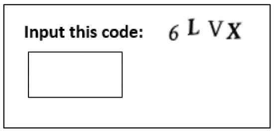 CAPTCHA, which stands for (Completely Automated Public Turing test to tell Computers and Humans Apart), provides a way for web service providers to make some assumptions about whether an end-user is human or robot []. The most famous way of protecting internet forms is to create a special image made up of letters and numbers and then require the user to enter it in a special textbox, as seen in Figure 1. CAPTCHAs serve as a network security approach, which are used for websites to avoid automatic form entering, spamming, automatic voting, etc. [].