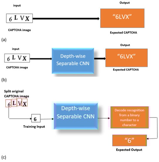 (a) The problem definition is to input a CAPTCHA image and output the same characters in the image, (b) the problem can be solved by passing the input image through the convolutional neural network (CNN) model to break the same characters simultaneously, (c) the pipeline of the proposed CAPTCHA breaking algorithm.