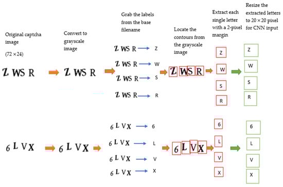 Based on previous works, Simard et al. [] and Jaderberg et al. [] used a traditional technique such as image processing to locate a single number or character regions in an image, and then segment them in order to recognize the individual characters. Yan et al. [] used the segmentation technique to segment Microsoft CAPTCHAs with a 60% rate of recognition [].