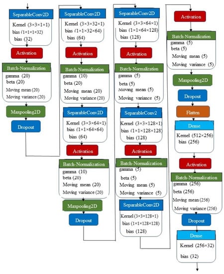 The proposed CNN architecture is inspired by MobileNets [], but in contrast to MobileNets, we introduce a lot of dropout layers and without a pointwise convolutional layer. The architecture of our proposed CNN model consists of six Depth-wise Separable Convolutional layers, seven Batch Normalization layers, seven ReLU activation function layers, four Dropout layers, three Max-pooling layers, one flatten layer, one fully connected layer, and one output Softmax layer.