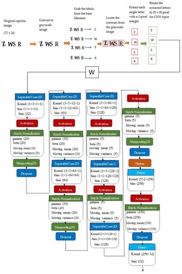 2.4. Network Structure and Parameters of the Proposed CAPTCHA Breaking Depth-Wise Saparable CNN