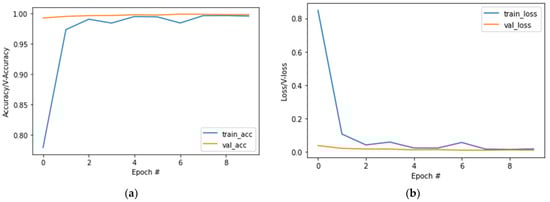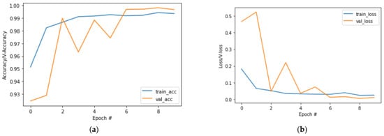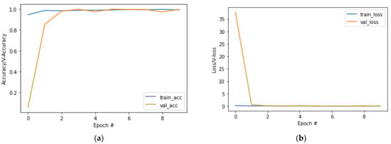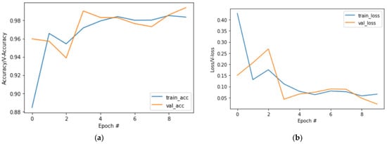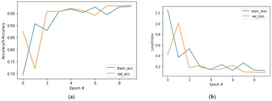 Figure 9a,b shows the accuracies and losses based on the fine-tuned MobileNets, respectively. The training time lasted for 10 s and 11 ms/step on the GPU.