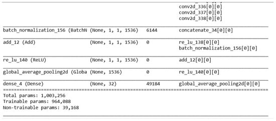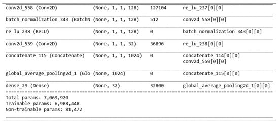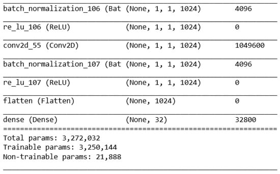 Furthermore, this current study evaluated the performance of the proposed CNN model through the transfer learning approach. In addition, the MobileNets architecture was fine-tuned and then trained on the same CAPTCHA dataset. The old classifier of the MobileNets architecture was removed, and a new classifier was replaced with 32 nodes. As shown in Figure 8, the network summary of the fine-tuned MobileNets showed a total parameter of 3,272,032. The total number of trainable parameters and non-trainable parameters showed 3,250,144 and 21,888, respectively.