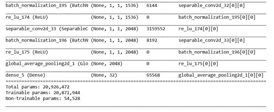 In this current study, in order to evaluate the performance of the proposed CNN model, the transfer learning approach was adopted. In addition, the Xception architecture was fine-tuned and then trained on the CAPTCHA dataset. The classifier part of the Xception network architecture was removed and replaced with a new one with 32 nodes or classes. As shown in Figure 14, which is the network summary of the fine-tuned Xception, there was a total parameter of 20,926,472. The trainable and non-trainable parameters were 20,871,944 and 54,528, respectively.