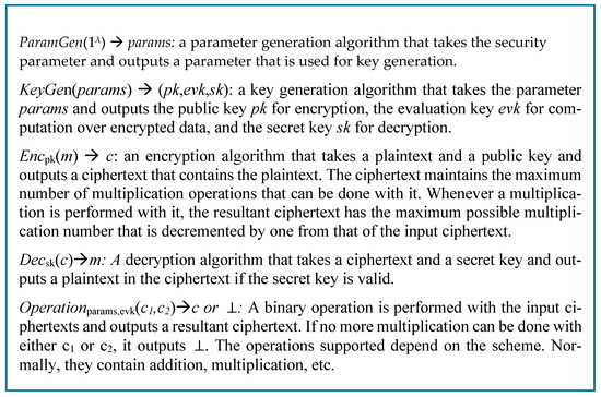 Somewhat HE (SWHE): SWHE [7,8,21] refers to homomorphic encryption methods that support a limited number of consecutive multiplications operations from a fresh ciphertext, which is, the ciphertext as a result of encryption, while the number of consecutive addition operations allowed is practically infinite. In generating the security parameters, the number of consecutive maximum multiplications operations that can be performed for a ciphertext, which is, the multiplicative depth of the circuit to be performed, is determined. The SWHE scheme is defined by the following algorithms in Figure 1.